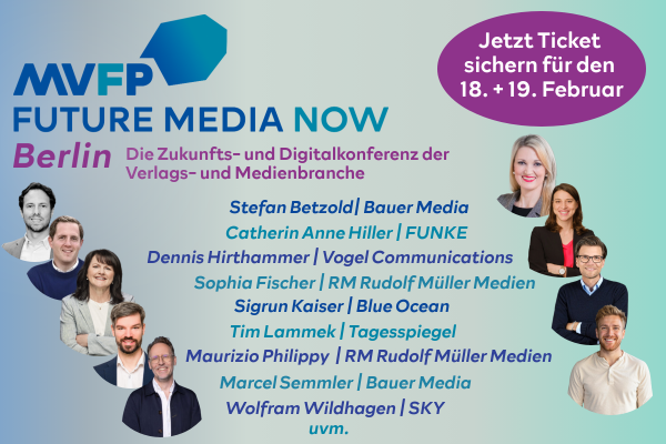 Future Media Now 2026 | Zukunfts- & Digitalkonferenz | 19. Februar | Berlin/Livestream Was bringt die Zukunft der Medienwelt? Was tun mit Gefahren durch AI-Bots & AI Overview? Wie geht Change? Dies und mehr ist Thema bei der FMN mit u.a. FUNKE, Vogel Communications, Bauer Media, SKY, Blue Ocean & Tagesspiegel. Mehr erfahren