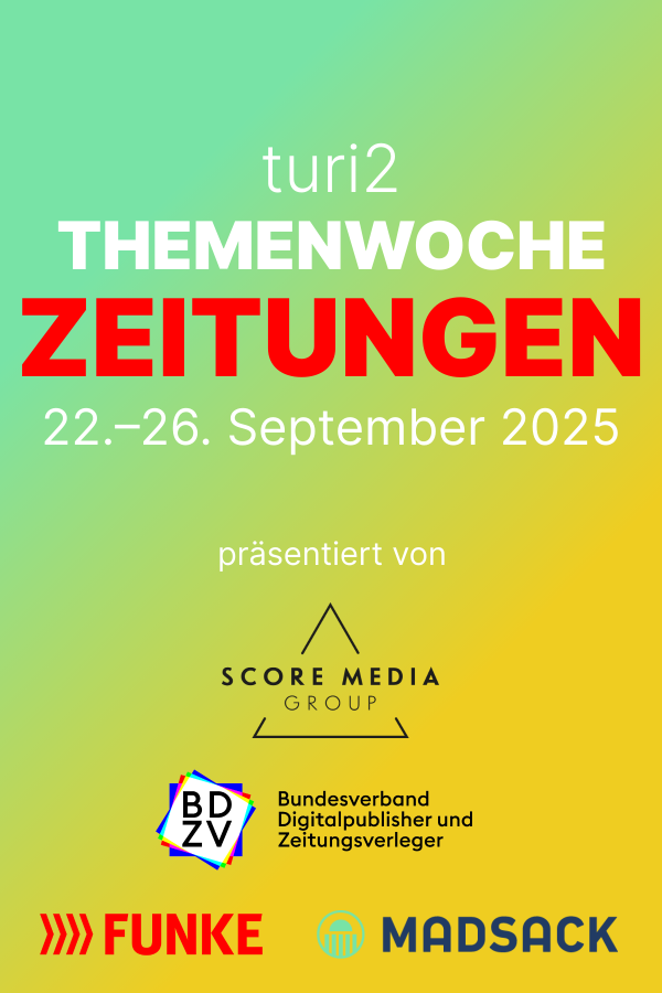 Zeit für Zeitungen: 54,4 Millionen Menschen in Deutschland greifen mindestens einmal pro Woche – gedruckt oder digital – zu einer der 316 Tageszeitungen in Deutschland. In der Themenwoche Zeitungen blickt turi2 in den Maschinenraum von Verlagen, Vermarktern und Verbänden. Wir fragen nach dem Stand der digitalen Transformation, nach Innovationen, Erfolgen und Herausforderungen. Mehr erfahren >>>