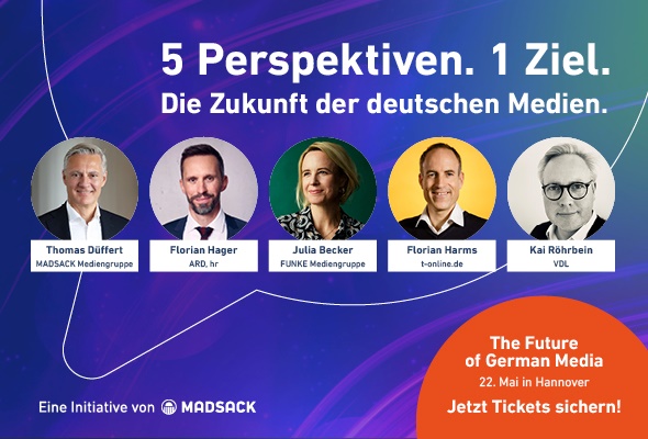 5 Perspektiven. 1 Ziel. Die Zukunft der deutschen Medien Fünf der wichtigsten Stimmen der Branche und eine zentrale Frage: Was braucht es, damit Medien in Deutschland auch morgen noch erfolgreich sind? Ein Perspektiven-Abgleich mit Thomas Düffert (MADSACK), Florian Hager (hr/ARD), Julia Becker (FUNKE), Florian Harms (t-online) und (Kai Röhrbein (VDL). The Future of German Media – Jetzt Ticket sichern!