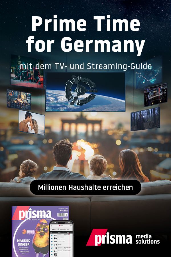 Mit täglich bis zu 3,5 Std. Deutschlands liebste Freizeitbeschäftigung: Fernsehen und Bewegtbild streamen. Immer dabei: prisma, der führende TV- und Streaming Guide. So wird ein Fernsehabend zu echter Prime-Time. prisma Media Solutions ist Ihr Zugang zu diesem attraktiven Werbeumfeld! Mehr erfahren