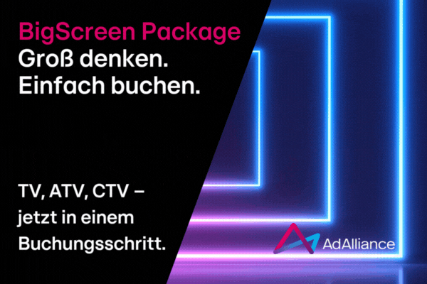 Einfach auf dem großen Screen werben! Das BigScreen Package vereint lineares TV, ATV & CTV in einem Schritt – weniger Aufwand, mehr Reichweite, noch mehr Wirkung. Wie einfach das geht, erfahren Sie hier. ->