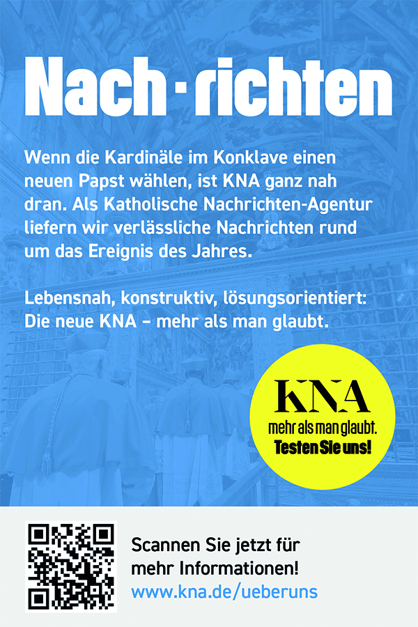Die KNA stellt sich neu auf! Eine der ältesten Nachrichtenagenturen Deutschlands präsentiert Nachrichten, NACH denen man sich RICHTEN kann. Verlässliche Orientierung und Einordnung aus christlicher Perspektive – auch nach der Wahl des neuen Papstes. Jetzt Kontakt aufnehmen und Expertise buchen!