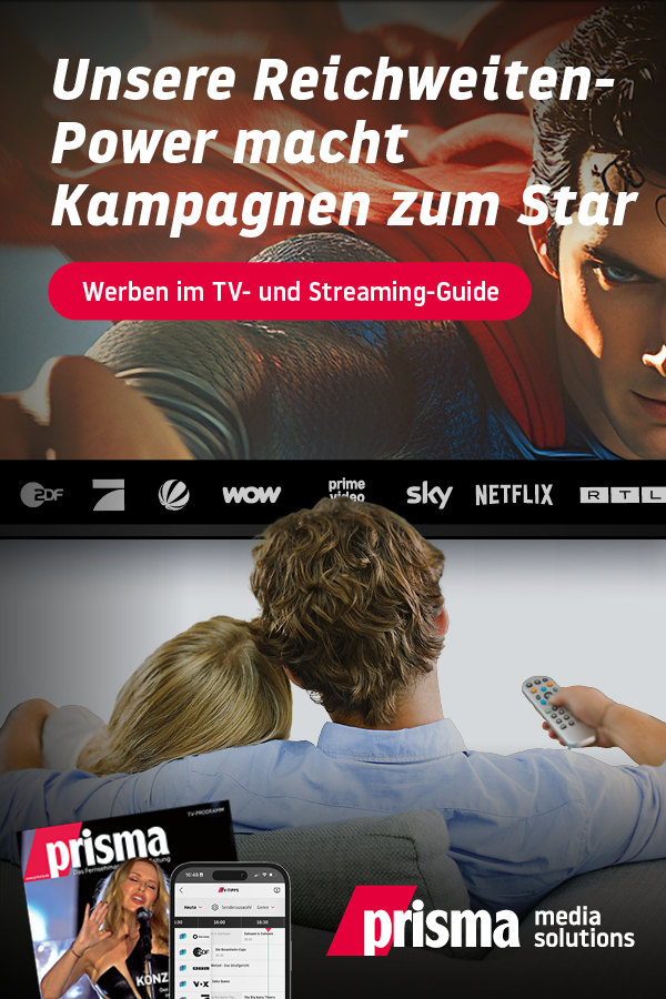 prisma hat die Momente mit dem größten Potenzial für Ihre Markenkommunikation! Denn prisma ist der Streaming- und TV-Guide für die persönliche prime-Time Ihrer Zielgruppe. prisma-Medien werden intensiv genutzt – das sorgt für hohe Reichweite, nachweisbare Wirkung und maximale Sicherheit. ->Mehr Infos