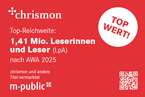 AWA 2025: Top-Reichweite für chrismon mit 1,41 Mio. chrismon bleibt seiner führenden Rolle im Magazin-Markt treu. 1,41 Mio. lesen jede Ausgabe intensiv (LpA). Ein absoluter Top-Wert, der sich sehen lassen kann – bei gleichzeitig sehr günstigem TKP von nur 18,30 Euro! Interesse? Hier erfahren Sie mehr.