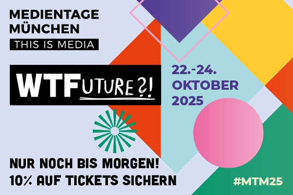 MEDIENTAGE MÜNCHEN 2025: Nur noch bis morgen 10% sparen! Bis einschließlich 1. Oktober gibt es den 3-Day-Pass zum Vorteilspreis. Erlebt drei Tage voller Diskussionen, Vorträge und Masterclasses zur Zukunft der Medienbranche, mit mehr als 300 Speakern und exklusiven Side-Events. Hier Ticket sichern